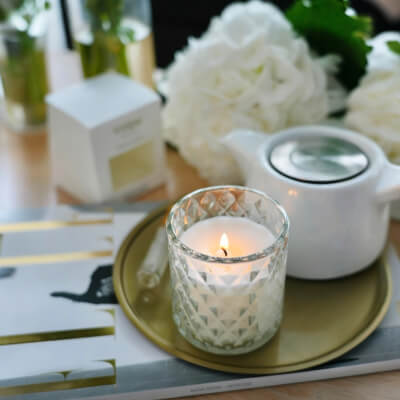 Scented Candle In Crystal Glass (Pack 1). A beautifully scented candle in an elegant crystal glass. A product that fits into the concept of modern interiors and suits many styles. Three unique fragrance compositions – Sensual Blossom, Velvet Bouquet and White Amber.